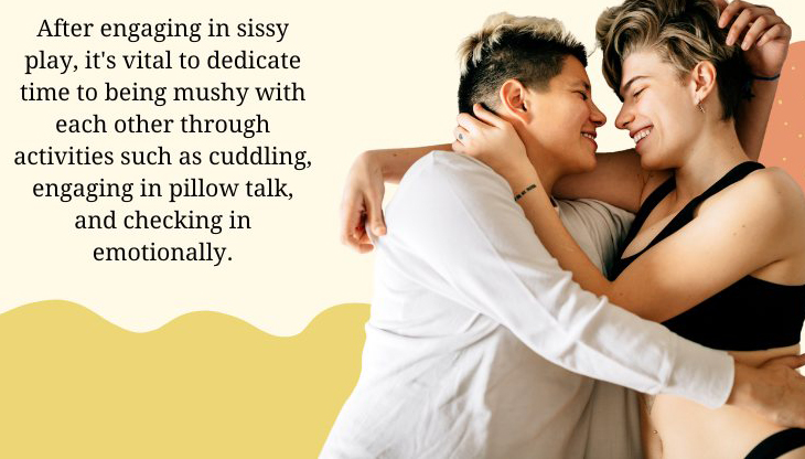 After engaging in sissy play, it’s vital to dedicate time to being mushy with each other through activities such as cuddling, engaging in pillow talk, and checking in emotionally.
