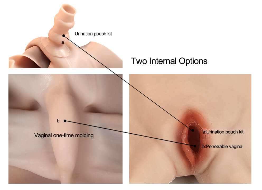 The bottom area also includes a sculpted Vagina that makes you feel even more feminine. You can opt to make it penetrable and include a urination pouch to make going to the bathroom easier. It comes in 4 different colors to better match your skin tone, and you can personalize it even further by adding pubic hair or removing mold lines.
