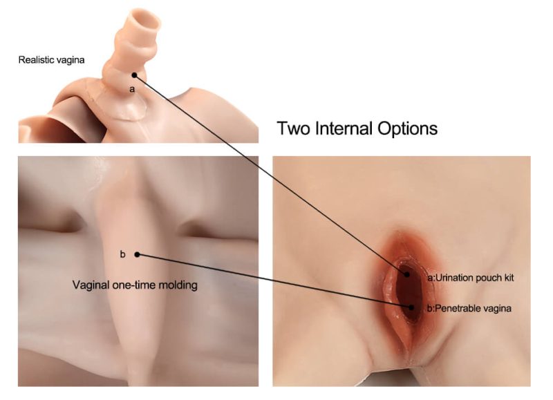 The main features here must be the sculpted part, which features an anatomically correct replica of female genitalia, also in silicone and still realistic. Once again, you can opt to make it fully penetrable and include a urination pouch.